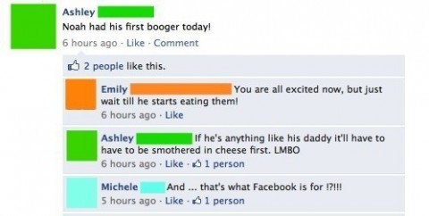There’s nothing worse than scrolling through Facebook on your lunch break and coming across something better left NEVER, EVER, EVER SEEN – EVER – but because some parents just do not understand social media, there it is in your news feed, floating on the Internet like the floater in the toilet. Because that’s what it is. A poop picture courtesy of a parent who doesn’t seem to realize that poop? Not the cutest thing their little cutems is ever going to do. Not by a long shot. We promise. 15 Parents Who Need to Get the EFF Off Facebook Open Slideshow 1. Little Booger Newsflash, folks! NO1CURR about your kid’s boogers. Nope. They don’t. View As List 1. Little Booger Newsflash, folks! NO1CURR about your kid’s boogers. Nope. They don’t. 2. Don’t Be This Dad Don’t be this dad. Ever. At all. Not even if you ARE a dude. 3. Damn Enter Key! This parent seems to have forgotten that the enter key starts a new comment and decided to share the play by play of the day in a 6-comment thread. 4. Doctorate Shmoctorate! Who CARES if you got a doctorate at 21 from Stanford? YOU’RE NOT A PARENT! YOU DON’T COUNT. 5. Daylight Savings Complainers Complaining about Daylight Savings Time and all your lost sleep might make you feel better. Or it’ll make you friendless. 6. Game of Poop What do you get when you combine a love of oversharing with a love of Game of Thrones? This parent. That’s what. 7. Humblebraggers Oh, the humblebragger. She wants everyone to know that her son is smarter than your son but (not so) cleverly disguises her sharing. 8. Lazy Days Oh, those lazy days of parenting! They’re totes not lazy! See? This parent can prove it! 9. Tub Poop Every parent has probably been here. Not every parent has felt compelled to share it on Facebook. At least there isn’t a picture. 10. Sleep Is For the Weak Sleep is a thing you don’t get to do anymore when you’re a parent. Complaining about it on Facebook makes you less sleep. IT’S A FACT. 11. Stroller Derby Hmmm, do I want the $300 stroller that normally goes for $500 or the $239? OOH! I WANT A MINI VAN! 12. So Much NOPE In the line of offensive baby attire, this might be the worst we’ve ever seen. Even worse than onesies declaring baby boys to be “boob men.” 13. That’ll Teach Her This mom decided to SHAVE HER DAUGHTER’S HEAD when the little girl got some safety scissors after her goldie locks. OMG! 14. They Just Can’t Win Even when this mom does it right by NOT being a narcissistic oversharer, she’s doing it wrong. Wait, what? 15. October Fools! Clearly the person who posted this can’t read the directions that came with her pee sticks. And the pictures on the test aren’t good enough. Or there’s the parent who constantly complains about everything from Daylight Savings Time and the lack of sleep to the fact that stores don’t open at 9:00 because that’s when she’s in the parking lot and doesn’t Target know that? I mean, doesn’t the world revolve around her kid’s nap schedule?? FOR THE LOVE. No. No it does not. So just stop it with that already! And stop it with your Mommyjacking, too! (Mommyjacking: a term used to describe the event which occurs when someone posts something great they’ve accomplished and a mommy comes along to say “nothing’s better than being a mommy!” or “just you wait until you’re a mommy!”) Anyway, scroll through the cringe-worthy gallery above for examples of 15 people who need to get the EFF OFF of Facebook IMMEDIATELY. And just for fun, after the jump, let’s also pay homage to those parents who take to social media to shame their children for myriad offenses. Because nothing says “this is for your own good” like humiliating kids on Facebook with an embarrassing picture that gets to live forever and ever thanks to technology … 13 Parents Who Humiliated Their Kids on Facebook Open Slideshow 1. I Really Relate to Taylor Swift Songs! Okay, the girl walked right into this one. Big time. View As List 1. I Really Relate to Taylor Swift Songs! Okay, the girl walked right into this one. Big time. 2. DTF? DTF? What does that mean? Mom and dad don’t watch Jersey Shore apparently … and we’re sorta jealous of them. 3. The Thug Life Chose Me You don’t choose the thug life, the thug life chooses you. You do, however, choose to befriend your parents on Facebook. 4. Justin Bieber Poster Child Abuse Covering your kid’s room in Justin Bieber posters is one thing. Doing it just so you can brag about it on Facebook is quite another. 5. Selfie Time! When your dad spoofs your selfies on Facebook, that may be a new (hilarious) low. 6. Socks Nothing is really lost until your mom can’t find it … except your pride. That can be lost for good. 7. How Did We Meet? The one word to describe how a mother and child first met … literally. 8. The Day We Met Another fond memory of how this Facebook user met some of the people in his life. 9. Good Save, Dad Dad really dug himself into a hole with this one, but recovered with a nice (albeit totally insincere) save. 10. Twerkin’ Out at the Gym! Not uncomfortable at all when your pop posts this to his timeline. 11. Photo Album Fun This is a common sight on Facebook. The easiest and most frequent way to humiliate your kids. 12. 50 Shades of Awkward Mom reads 50 Shades of Grey. And will tell you all about it in front of everyone you know. 13. Does Your Wife Have to Look at That? Questions you don’t need to be putting on Facebook in general … especially if you are “friends” with your folks on there.