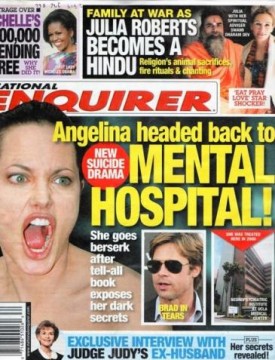 We’ve witnessed her “steal” a woman’s husband. We’ve heard about her scandalous old drug photos . We’ve reported on her being blackballed by her family . We’ve seen stories about her being a vindictive, jealous control freak who makes children cry and stages bogus happy family photo ops for positive PR. At this point, what gossip hasn’t been written about Angelia Jolie? That she’s been committed to a mental institution? Nope, you can now add that to the list: SHE’S INSANE!!! Probably not really … but look at that photo! According to the National Enquirer, Angelina Jolie’s notoriously crazy outbursts have flared up in spades in light of a new tell-all book about her dark, sordid past. The tabloid, with already alleged a suicide attempt by Jolie late last year, says she’s headed off to the loony bin after a meltdown that has left Brad Pitt in tears. Somehow we suspect if Angelina were institutionalized, we’d have heard about it, or the National Enquirer wouldn’t be the source of such a bombshell story. Then again, we thought the same about John Edwards’ affair with Rielle Hunter, and Tiger Woods’ dalliances with Rachel Uchitel, so you never really know …