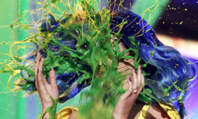 Oh there is a devil and he finally listened to us mooching on about how much we dislike Katy Perry. Appearing at the Kids Choice Awards in LA this weekend to present a gong – the crapola singer was sprayed in the face with green gunge (oh how we would’ve liked to be behind that gun) – and it must have been a good ole’ gunging, cause she ended up falling over on her useless arse. Watch this wonderful moment below…we are, again and again and again….