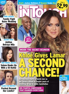 Khloe Kardashian has not moved past her divorce. The reality star recently said she is still working through her split from Lamar Odom. So, to paraphrase one of our favorite Dumb and Dumber quotes … is she saying there’s a chance?!? “I want to make it work with Khloe,” Odom admitted to In Touch Weekly while staying in New York recently. But does Khloe want to make it work with her estranged husband? Apparently, if you believe the giant tabloid headline above. Odom signed with a basketball team in Spain last month, only to injure himself and leave the squad last week. He says he’s “focusing on getting better,” and Kardashian is allegedly willing to hear him out. “He confessed his feelings and cried his heart out to her on the phone,” a family insider says of a game-changing mid-March phone chat. “She’d been avoiding his texts and calls for weeks, but when she heard him pleading with her to take him back, she melted.” Just a few days ago, Khloe did vow to lift the fallen and live life as a healer. Might this be a hint at her intentions to reconcile? Or might this cover story be another example of a tabloid just messing with us when it comes to the Kardashians? 41 Krazy Kardashian Tabloid Kover Klaims Open Slideshow 1. Kim Kardashian Butt Problems Oh no! Kim Kardashian’s butt won’t stop growing! What will the reality star do? View As List 1. Kim Kardashian Butt Problems Oh no! Kim Kardashian’s butt won’t stop growing! What will the reality star do? 2. OJ as Khloe Kardashian’s Father? Bombshell alert! OJ Simpson may be Khloe Kardashian’s father. Do you believe this rumor? 3. Kim Kardashian: Under Kanye’s Control! Kim Kardashian is apparently being controlled by a madman named Kanye West. Tough break for the reality star. 4. Kardashians Split! Is it all over for Kourtney Kardashian and Scott Disick? Yes, based on this cover story. 5. Bruce Jenner Tell-All? Is Bruce Jenner going to write a tell-all? We doubt it, but you never know. 6. Kris Jenner and Ben Flajnik Cover Kris Jenner has been hooking up with Ben Flajnik. This cover story confirms it, clearly. 7. Kourtney Kardashian Wedding Story Is a wedding finally on the way for Kourtney Kardashian? This magazine claims she will tie the knot with Scott Disick. 8. Kim Kardashian is a Cheater! Kim Kardashian is a weight loss cheater! And she’s apparently been caught by Life & Style. 9. Kim-Kanye Wedding Cover The Kim Kardashian-Kanye West wedding is on hold, people! Will they ever make it down the aisle? 10. Khloe Kardashian: In Tears! Khloe Kardashian has one question when it comes to her sister’s engagement: Where is MY happy ending?!? 11. Kylie Jenner and Kendall Jenner Cover Are Kylie Jenner and Kendall Jenner teenage trainwrecks? Yes, according to Star. 12. Bruce Jenner to Destroy Kris Jenner? Bruce Jenner is out to destroy Kris Jenner. Will he succeed? 13. Kim Kardashian Bikini Body: The Return! It’s back! Kim Kardashian has regained her bikini body! We knew she could do it! 14. Kim Kardashian on Life & Style Cover Kourtney Kardashian is pissed at Kim Kardashian, according to this tabloid. She wants her sister to “act like a mom.” 15. Kim Kardashian and her New Body Kim Kardashian has a new body! Hooray for her! Check it out on this tabloid cover. 16. Exposing the Kardashians Kris Jenner’s sister cannot remain quiet any longer. She spills the family’s secrets in this issue of In Touch Weekly. 17. Kim Kardashian Dumped Cover Kim Kardashian has totally been dumped by Kanye West. Too bad. We liked these kids together. 18. Khloe Kardashian Baby Cover Khloe Kardashian wants to adopt. Who cares about her problems with Lamar Odom?!? 19. Lamar Odom Tell-All Claim Lamar Odom is totally writing a tell-all… if you believe this tabloid cover for some reason. We somehow do not. 20. Double Kardashian Divorce? We know Khloe Kardashian has been going through a lot. But this cover story claims Kris Jenner is also headed for a divorce. 21. Khloe Kardashian Divorce Story Khloe Kardashian could headed toward a $75 million divorce. Are you buying this cover story? 22. Kim Kardashian Baby Plea Kim Kardashian apparently wants the world to meet North West. But this tabloid cover claims Kanye is against it. 23. Kim Kardashian: So Tortured! Kim Kardashian is reportedly tortured by her very own body. That has to be kind of awkward. 24. Khloe Kardashian Kover Klaim Khloe Kardashian is facing her worst nightmare. Lamar Odom clearly had unprotected sex with another woman. 25. Kim Kardashian Pregnant Story No way Kim Kardashian is pregnant again…. right?!? Try telling that to this tabloid cover story! 26. Kim Kardashian Wedding Story Kim Kardashian wants to marry Kanye West. According to this Us Weekly cover story, at least. 27. Khloe Kardashian Star Cover Khloe Kardashian is not looking her best in this photo. She is not acting her best, either, apparently. 28. Kourtney Kardashian: Pregnant Again? Is Kourtney Kardashian pregnant again?!? Yes, according to this tabloid at least. 29. Khloe Kardashian Tabloid Picture Khloe Kardashian will raise her baby alone, dammit! Granted, she doesn’t have a baby. But still. 30. Khloe Kardashian In Touch Cover The marriage between Khloe Kardashian and Lamar Odom is on the rocks. If you believe this issue of In Touch Weekly. 31. Khloe Kardashian: Done! Khloe Kardashian is totally done with her marriage. If you are believing this tabloid cover, that is. 32. Khloe Kardashian Cover Will Khloe Kardashian be next? This cover story claims she is dead set on becoming a mother. 33. Kim Kardashian Weight Story Kim Kardashian is obsessed with losing her baby weight. So states this In Touch Weekly story at least. 34. Kim Kardashian: I Just Can’t Do This! Kim Kardashian says she just can’t do this. At least In Touch Weekly claims she says that. 35. Kanye West Cheating Claim Kanye West totally cheated on Kim Kardashian. If this cover story is to be believed, that is. 36. Kim Kardashian Lif