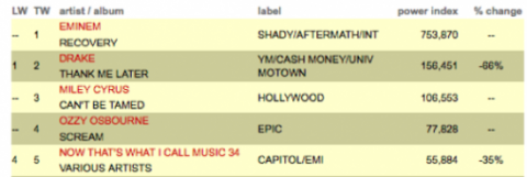Miley Cyrus has made it painfully clear for weeks now: she simply cannot be tamed. But while this may be true in her wardrobe choices , the singer was cut down to size on the music charts last week. Her latest album, “Can’t Be Tamed,” finished third in sales, behind Eminem’s “Recovery” and Drake’s “Thank Me Later.” It was expected that Eminem would lead the way, but not by this wide of a margin. His new CD had the biggest opening week of any in 2010, moving over 753,000 copies. As for Miley? She has to be disappointed, as “Can’t Be Tamed” sold just 106,000 albums. That’s an astounding 250,000 fewer than Cyrus’ 2008 effort, “Breakout.” Miley’s fans will surely complain about our biased coverage now and make up excuses for their favorite artist. And that’s fine, that’s their right and we admire their passion. But numbers don’t lie : recent poll results show 70% of respondents laugh at the idea of Cyrus as a role model; moreover, her new CD actually sold fewer copies than her previous CD sold in its second week of release. As we’ve been saying all along, is it possible Miley’s new image may have gotten her attention, but turned away her fan base? Might she have been better served by slowly evolving as an artist, as opposed to pulling every transparent, cheap trick in the book just to prove she’s changed? These are questions Miley, her handlers and her cult-like followers will need to consider carefully.
