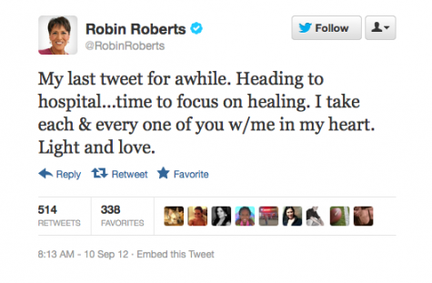 Having said goodbye to her mother for the final time last week, Robin Roberts took to Twitter this morning and bid farewell to her fans. But only for now. In light of her pending bone marrow transplant to treat a rare blood disorder, the Good Morning America co-anchor Tweeted the following note a few hours ago: Roberts is expected to miss two to three months as she deals with this surgery and subsequent recovery. In her place, GMA will seat such major names as Katie Couric, Barbara Walters and Kelly Ripa alongside George Stephanopoulos. But they are merely keeping Roberts’ spot warm, of course. She has every intention of returning to the morning program and we have every intention of tuning in once she does. Get better soon, Robin! We’re all pulling for you.