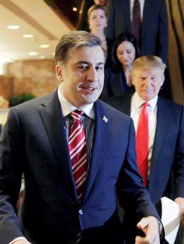 Mikhail Saakashvili, left, President of Georgia, and real estate developer Donald Trump arrive at a news conference in New York, Thursday, March 10, 2011. Trump and a Georgian development group have agreed to build a Trump Tower in Georgia. Trump indicated he is seriously considering a run for the U.S. presidency. The 64-year-old also pressed his case that President Barack Obama may have perpetrated “one of the greatest scams in the history of politics, and in history period,” by being elected