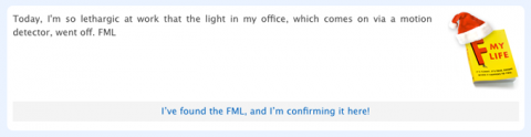 Find the 10 FMLs that were published in the fmylife book by hunting for them amongst the website’s pages, and win one of the fmylife books up for grabs. Before explaining the rules, your mouse can already start hating us because it’s going to have to go into overdrive. Quotes from the book’s FMLs are hidden in the pages of Fmylife, and you’re going to have to find them. How to enter the competition Step 1 : Sign up on FML and log in. This is mandatory if you want to take part in the competition. Click here to create an account. Everyone can enter the competition. No matter where you live or how old you are. Step 2 : Find the link called “FML Competition” in your member’s panel on the right hand side of the site. Step 3 : Click on it (yeah OK, seems obvious, but you never know with some people). Step 4 : Follow the instructions to start the hunt. None of the members will have the quotes in the same place. To find them, use the page numbers at the bottom of the home page and… click away (and you can then start hating us). The quotes will only be in the website’s archives, nowhere else. There’s thus no point going into the Top, the Flop, the Random FMLs… All you have to do is go and look in the previous pages. Once you’ve found one of the texts, a link will allow you to update your participation. This is how a hidden quote will look like (the size has been reduced a little voluntarily): On the 20th of december at midnight, the competition will end. All the people who’ve found the 10 quotes will then be part of a draw, which will select the 20 winners, who will get a copy of the book. The results will be announced on the 21st. Good luck, and happy clicking to all!
