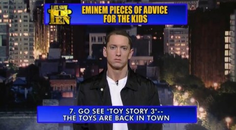 Eminem’s rapping talent is inarguable. I’ve seen him do it! You have to trust me here. He’s deft, aggressive, even poetic sometimes, but what is it about rapping that makes the 37-year-old artist feel qualified to attempt sketch comedy on television? Eminem usually does such a good job of convincing me that he doesn’t give a f*ck, but his frequent detours into TV comedy send the wrong message: that he’s actually kind of desperate to entertain, even if he feels awkward doing it. Now he’s scheduled to read off one of David Letterman’s Top 10 lists, and its preview proves to be another in a comedy career that has yet to take off. Come with me on a narrated tour of Em’s laughless TV past.