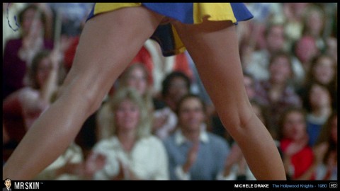 It may not have the name recognition of, say, Return of the Jedi (1983), but if you were ever paralyzed by lust watching cheerleaders do high kicks back in high school, then our Blu-ray Ninja ‘s newest discovery will hit you like a brass nunchuck to the noggin. The Hollywood Knights (1980) features cameos from Fran Drescher and Michelle Pfeiffer before they were famous, but it’s breast known here at Skin Central for the nude talents of Dawn Clark , Kim Hopkins , and sexy cheerleader Michele Drake , who puts some extra pep in a pep rally by forgetting to wear panties under her miniskirt. We always knew there was bush in this scene, but in the new Blu-ray edition our Ninja has unearthed some lovely lower lip from the marvelous Michele. Shake that pom-pom, girl! Members can unsheathe their broadswords with more from The Hollywood Knights right here at MrSkin.com!
