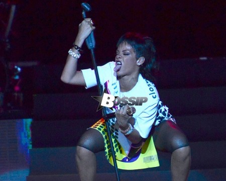 Rihanna Gets Vulgar While Performing On Stage In Singapore Rihanna is no stranger to badgal behavior, but she really turned it up a notch for her recent performance in Singapore. Rocking her new self-coined “ghetto goth” look, raunchy Rih-Rih and her mullet gave fans an eye full of her crotchylicious get up which included thin fish net stockings an overcoat and white platform sneakers. She also didn’t hesitate to grab a handful of her goodies and twerk it out throughout the performance. Looks like everybody in attendance definitely got their money’s worth in one way or another. You can peep more pics from Rih’s slorely sing-a-long performance below. WENN/SplashNews