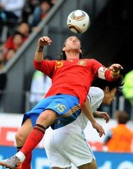Spain#39;s Sergio Ramos(L) and South Korea#39;s Ahn Jung Hwan fight for an aerial ball during their friendly match prior to the FIFA World Cup 2010 hosted by South Africa. Spain won 1-0. European champions Spain eked out a 1-0 victory over South Korea in a World Cup finals warm-up match here on Thursday. The match had promised to be an exciting meeting, with Spain hoping to exorcise the ghosts of the 2002 World Cup, when they were stunned by South Korea in a controversial quarter-final in wh