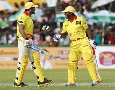 Sri Lanka#39;s cricketer Muttiah Muralitharan (R) speaks with Bollywood actor Sunil Shetty during the International Indian Film Academy (IIFA) foundation celebrity cricket match in Colombo June 4, 2010. The awards will take place in Colombo from the 3rd to 5th of June 2010. Dinesh Chandimal scored his first international century to steer Sri Lanka to a six-wicket win over India in the tri-nations one-day series on Saturday. The 20-year-old right-hander hit 111 off 118 balls at Harare Sports Cl