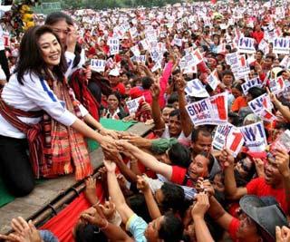 Yingluck Shinawatra (L), sister of fugitive former Thai prime minister Thaksin Shinawatra, shakes hands with her supporters during her election campaign in Ubonratchathani province. Thailand#39;s rival political camps launched a last-minute appeal for votes Saturday on the eve of a hard-fought election seen as crucial to the future of the kingdom after years of often bloody unrest. About 170,000 police are to be deployed to protect polling stations for the tense vote, which comes little more t