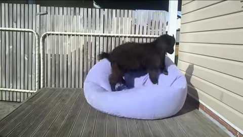 This goat is trying to climb a bouncy chair. Let’s laugh at it.