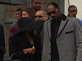 ‘I’m so honored, so happy that you gave me the opportunity, God, to know Nate Dogg,’ Snoop eulogized at funeral. By Rahman Dukes Snoop Dogg arrives at Nate Dogg’s funeral on Saturday Photo: MTV News LONG BEACH, California — On a dark and damp Saturday morning (March 26), thousands of family, friends and fans turned out for one last show from their hero, rap legend Nate Dogg , who was laid to rest in his hometown of Long Beach. Inside the Long Beach Cruise Terminal, lights shined down on the wooden coffin adorned with red and white flowers. Two jumbo screens on opposite sides of his casket flashed six different photos of the singer from a childhood boy, when he was known to family as “Buddy,” to the platinum singer known to the world as Nate Dogg. West Coast rap artists including Dr. Dre, Game, DJ Quik, Mack-10 and WC, DJ Pooh, Battlecat and others were on hand to pay their respects to the singer with platinum vocal chords. “1986, Poly High School, that’s where we connected for the first time,” an emotionally distraught Snoop reflected on his friend. “We didn’t know each other, but the music connected us. We built a brotherhood, a friendship.” Snoop first met Nate along with his best friend Warren G at the school where they would go on to form the rap trio 213. Warren G spoke briefly, reminding mourners in attendance what a great man the music world has lost. “It hurts me so much to see this,” Warren G said somberly while looking down at the casket. “We been through a whole lot and that was my dog. He stayed down with me from the bottom to the top. I didn’t ever think I would have to sit at a funeral for one of my dogs. All I can say is that was my friend, me him and Snoop was 213 from the balls to the walls. The music industry lost an incredible artist.” Several of Nate’s closest friends, relatives and colleagues including Xzibit, Daz and Kurupt, Butch Cassidy, Los Angeles radio station personality Big Boy from Power 106, and producer FredWreck all shared memorable stories of their friend, who they said made an important impact on their lives. Xzibit recalled a time during the Up in Smoke Tour when Nate was arrested, but hours later somehow magically appeared at the show’s next date. A teary-eyed Kurupt said Nate was the father figure who raised him. Manager Rod McGrew acted as Nate’s manager throughout his professional music career and was with him up until his last days. “He fought a hard fight,” McGrew said. He also thanked Dr. Dre and Eminem, in addition to Snoop, Warren G and Xzibit, for assisting the family in getting through the past several days. “The last three years were unbelievable. He didn’t give up. He just had a talk with God and gave up. Two hours before that he was fine.” McGrew said that with Nate’s passing, the singer’s three wishes will now be granted. “He wanted to go to heaven and hang with his boys,” McGrew said. “He loved Tupac. He recorded with him. He wanted to hang with Biggie. But the most important thing is that he can walk around heaven with his favorite artist of all time, Michael Jackson.” With his deep, melodic voice and smooth soul rumble, Dogg was one of the key elements in the rise of the West Coast G-Funk sound pioneered by Death Row Records in the early 1990s. Along with Dr. Dre, Snoop Dogg and Warren G, Nate was a critical participant in a number of major left-coast gangsta hits, including G’s “Regulate” and Dre’s iconic solo debut, 1992’s The Chronic. The hip-hop singer passed away earlier this month after suffering multiple health setbacks in the past several years stemming from separate strokes. The choir that sang during Nate’s home-going was handpicked by the singer himself. One of its members, Jacob Lusk , is currently a contestant on “American Idol.” “He was a loving caring individual,” said Snoop. “If you listen to his music, he took church melodies and flipped it with hip-hop. I’m so honored, so happy that you gave me the opportunity, God, to know Nate Dogg. I want to stand here and cry, but I have to have the strength for you Nate Dogg. It’s 213, DPG for life.” Related Videos Remembering Nate Dogg Related Photos Nate Dogg Laid To Rest, 03.26.2011 Related Artists Nate Dogg Snoop Dogg Warren G Dr. Dre DPG