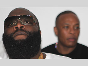 Miami’s Club Amnesia filled with hip-hop royalty Sunday night in honor of Maybach Music MC. By Rahman Dukes Rick Ross and Dr. Dre Photo: MTV News MIAMI — Rick Ross cemented a weekend of jet-set partying for his 36th birthday in ultimate style Sunday night at his home base in Miami, surrounded by some of his closest friends and thousands of fans. Club Amnesia was packed wall to wall with almost no wiggle room, filled with hip-hop heavyweights and club revelers watching closely, competing to get a shot of the action. Ross ascended from a chauffeur-driven black Maybach shortly after 1 a.m. with companion DJ Khaled by his side. Decked out in his signature coconut-colored silk threads, the hefty MC was swiftly ushered by his Maybach Music entourage inside the venue. Fans cheered, “Happy birthday, boss,” as an elated Ross made his way to Amnesia’s top-level VIP area, where dozens of music celebrities — including producer/singer Sean Garrett, actor Evan Ross and powerhouse producer Dr. Dre — were waiting in the wings for his arrival. Dre was easily the night’s most-talked-about guest, as the sight of him and Ross together confirmed their union after being spotted hanging out together in Miami recently. Soon after Ross, the celebrity arrivals began to flow in sync with the hundreds of bottles of Moet Rose champagne and Ciroc vodka that were delivered to his seating area. Party host Diddy showed up soon after with an entourage consisting of new Bad Boy artist French Montana, Cassie and his son Justin. Minutes later, Wiz Khalifa and girlfriend Amber Rose joined the party. “This is your night!” Diddy shouted at Ross, alongside a grinning Khalifa by his side. Ross, with Dre directly behind him, raised a glass filled with pink bubbly. As the night continued full steam, other hip-hop artists including the LOX, upstart Chicago crew L.E.P. and singer the Dream separately made their way to greet the Bawse. At one point, there were whispers that Young Money superstar Drake was also present in the building, but the Canadian MC was nowhere to be seen. One of the most-touching moments of the night was a snapshot of Ross and former business manager and Poe Boy head E-Class exchanging hugs and pounds. Class had been a longtime associate of Rozay since his earlier days, until the two had a recent falling out that ended their business relationship. Wrapping up the night in traditional fashion, Ross and his MMG family exited the empty-bottle-strewn VIP area and made their way to the stage for an impromptu performance. Ross gave the audience their money’s worth, performing hit after hit from his war chest of club anthems. “They say I’m getting money, must be Illuminati/ Talking to the Holy Ghost, in my Bugatti,” Ross rapped on the track “Holy Ghost” off his Rich Forever mixtape. “He knockin’ on the door, don’t let the devil iiiinnn.” On this night, the larger-than-life MC had his way, no doubt to be blessed with another banner year. Related Artists Rick Ross DJ Khaled Diddy Dr. Dre
