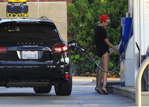 My, my, Miley… Miley Cyrus Spotted Pumping Gas Dressed Like A Ho Miley Cyrus has been sold out of f**ks for quite some time now. That said, she still finds ways to make us stop and say “Damn b!^*#, is THAT how you feel?!”. Tuesday, the leggy, blonde, piff puffin’, ex-Disney puppet was seen pumping gas in L.A. wearing what appeared to be a hooker’s wardrobe, or a really bad Rihanna impersonation. There is a time and place for everything…we think the time and place for this lil’ get up is on an Atlantic City street corner around midnight or so. Ladies, what do YOU think about Miley’s slorey steez? Sidebar: Her twerking would have been much more entertaining if she had been dressed like THIS. Image via FameFlynet