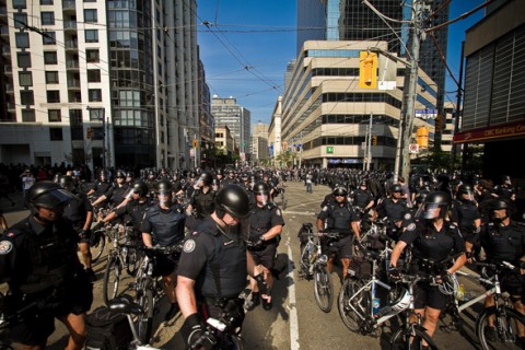 I find this picture in BlogTO by Ronnie Yip to be extraordinary; The Ontario Coalition Against Poverty , a well-known group of rabble-rousers is preparing to march, and the police are out in force. But unlike the Battle of Seattle , the police are out to meet them, not in head-to-t… Read the full story on TreeHugger