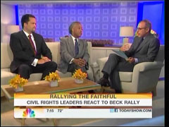 NBC’s Matt Lauer, on Monday’s Today show, invited on the not-so balanced panel of the Reverend Al Sharpton and the NAACP’s Ben Jealous to analyze Glenn Beck’s “Restoring Honor” rally that took place on the 47th anniversary of Dr. Martin Luther King’s “I have a dream speech” with Jealous proclaiming that “if Dr. King stood up there” the conservatives in attendance would not have “responded well” to him. Jealous went on to say Dr. King’s “last campaign” was the “poor people’s campaign. To make sure that all people…can find a good job, all kids can go to a great school. And Mr. Beck, that’s not what he talks about. And that’s not, that doesn’t seem to be what he actually wants.” This led Lauer, ignoring the fact that rally attendees also want those things, that they just differ on the methods to get there, to observe: “It seems like you guys are saying, without saying, that you’re looking at what happened and you’re looking at Glenn Beck as somewhat of a wolf in sheep’s clothing.” The following Kelly O’Donnell set-up piece and Lauer interview with Sharpton and Jealous was aired on the August 30 Today show: ANN CURRY: As Brian mentioned, talk show host Glenn Beck drew a big crowd at the National Mall in Washington this weekend including guest speaker Sarah Palin for a controversial rally he called “Restoring Honor.” NBC’s Kelly O’Donnell has a wrap-up now. Kelly, good morning. [On screen headline: “Rallying The Faithful, Glenn Beck ‘Restoring Honor’ Rally Draws Thousands”] KELLY O’DONNELL: Hi, Ann. There is still so much to debate this morning. From the size of the crowd — was it 80,000 or as Brian mentioned, more than 300,000 — to the motives behind calling the rally for this place on a very famous anniversary. Now Glenn Beck did try to set one rumor straight. He says he and Sarah Palin won’t be running for anything. Beck says he has zero political aspirations. GLENN BECK: It has nothing to do with politics! It has everything to do with God! O’DONNELL: Conservative media star Glenn Beck insisted on that “no politics” distinction. Still, the massive rally easily looked like a political event. SARAH PALIN: We must restore America and restore her honor! O’DONNELL: Beck did not criticize President Obama from the stage but has been harsh, even calling Mr. Obama racist last year. BECK: This president, I think, has exposed himself as a guy over and over and over again who has a deep-seated hatred for white people or the white culture. O’DONNELL: Appearing on Fox News Sunday, Beck said he now regrets that comment. BECK: It shouldn’t have been said. It was poorly said, and it was not accurate. O’DONNELL: Back at the rally, many who came from around the country did criticize the President’s politics. UNIDENTIFIED WOMAN: I believe in our Constitution, and this administration doesn’t. UNIDENTIFIED MAN: I, I cannot disagree with our president more. I believe he’s leading this country in the wrong direction. O’DONNELL: Others criticized the time and place, held on the 47th anniversary of Martin Luther King Jr.’s “I have a dream” speech. Beck called that timing a coincidence. He and Palin praised King. PALIN: We feel the spirit of Dr. Martin Luther King Jr. O’DONNELL: But civil rights activist Reverend Al Sharpton led a smaller, competing rally. REVEREND AL SHARPTON: They want to disgrace this day! And we’re not giving them this day! This is our day, and we ain’t giving it away! O’DONNELL: The context is full of tension. Beck also said his rally would reclaim the civil rights movement. BECK: Meaning people of faith that look at equal justice and look at every man the same. That’s who needs to reclaim it, not the politicians. Not the parties. Not white people or black people. O’DONNELL: And Beck tried to sort of shape some of the imagery here. He had asked some of the followers not to bring signs and often signs at these sort of events, if they have controversial images or words attract a lot of negative attention. And interestingly Beck said he regretted those words calling the President a racist but said he was not retracting them, simply amending them. Matt? LAUER: Kelly O’Donnell, Kelly thanks very much. As you just heard the Reverend Al Sharpton led his own rally this weekend. Ben Jealous is the president of the NAACP. Guys, good morning to both of you. AL SHARPTON: Good morning. BEN JEALOUS: Good morning. LAUER: So much talk leading up to this rally, Reverend Sharpton, and now so much analysis afterward, people worried about the timing, the date, the location, the 47th anniversary of Dr. King’s speech, thinking it was some kind of political rally masquerading as a non-partisan rally for patriotism and responsibility. In the end, wasn’t it fairly uneventful? SHARPTON: Yeah and, and you wonder whether that was designed that way because, just remember now it was Mr. Beck himself that was saying this is gonna be to “reclaim civil rights. I’m gonna do this and that,” attacking the President. And then he comes and does none of that. So I don’t know if it was his promotion or whether we’re seeing the true political strategy. LAUER: But when I, but when I saw you speaking there at your own rally saying “we’re not gonna let him have this day, this is our day,” in the end is it a case of “never mind?” I mean was there no offense? SHARPTON: No, what the offense is to try and cast that as civil rights. Blacks, whites, we had many speakers of all races that are legitimately in civil rights, union leaders, the Secretary of Education, people that are trying to deal with the inequality in this country. We’re not talking about the day didn’t belong to blacks or whites. The day does belong to those that believe in what Dr. King’s dream was about. LAUER: Mr. Jealous there were many people at that rally who said we need to honor the legacy of Dr. King. When you watched