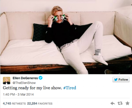 The morning after she posted an Oscars selfie that set a Twitter record, Ellen DeGeneres took to that social media network again and made it very clear: Hosting the Academy Awards is tiring! “Gopd mrorining! It’sd time to do a live OSxar show,” the comedian joked today. “Didn’t get much slep but whoneds it?” Ellen then added the following photo as she sat in her talk show dressing room: How did this star do a host? She mocked Liza Minelli for looking like a drag queen… made fun of Jennifer Lawrence for falling a lot and deemed Jared Leto the most beautiful celebrity in attendance. Watch the Ellen DeGeneres monologue now and sound off on her emcee duties now. Then, toggle through the most memorable moments from the 2014 Academy Awards below, GIF style! Oscars 2014 GIFs: The Best Moments Open Slideshow 1. Jennifer Lawrence Laughs Jennifer Lawrence laughs at her own expense at the Oscars. It’s why we love her. View As List 1. Jennifer Lawrence Laughs Jennifer Lawrence laughs at her own expense at the Oscars. It’s why we love her. 2. Jennifer Lawrence Falls at Academy Awards This is why she had to laugh at her own expense. 3. Why Are You Laughing?! We have absolutely no idea, Jennifer. Absolutely no idea. 4. Best Selfie Ever Bradley Cooper prepares to take the best selfie ever with Ellen’s phone at the Oscars. 5. Ellen DeGeneres Oscar Selfie This was the result! 6. Amy Adams and Pharrell Dancing Amy Adams and Pharrell dancing at the 2014 Academy Awards. Makes us “Happy”! 7. Pharrell and Lupita dance Lupita and Pharrell dancing at the 2014 Academy Awards … pretty great moment. 8. Meryl Streep and Pharrell Meryl Streep and Pharrell dancing at the 2014 Academy Awards in a moment you probably couldn’t have ever predicted. 9. Lupita and Liza Hug Winner Lupita Nyong’o gets a hug from Liza Minnelli at the 2014 Academy Awards. 10. Lupita Nyong’o Wins! Lupita Nyong’o celebrates her Oscar victory. And it was well earned! 11. Poor Leo #PoorLeo actually trended on Google after DiCaprio lost to Matthew McConaughey. We imagine he’ll be okay. 12. Bette Midler Performs Bette Midler performs at the 2014 Academy Awards, bringing back memories. 13. I Will Order Pizza Ellen promises to order pizza to tide people over at the Oscars, and she delivered … well, some guy did. But you get the idea! 14. Pizza Money Harvey Weinstein pitched in a full $200 to Ellen’s food fund at the Oscars. 15. Brad Pitt Gets Pizza Brad Pitt grabs some pizza after Ellen had one some to the Academy Awards. Show does drag on like no other. 16. Ellen Creeps on Sandra and Leo Ellen DeGeneres hilariously sneaks up behind Sandra Bullock and Leonardo DiCaprio at the Oscars. 17. Princess Ellen Ellen came out dressed like this at one point. Enough said, really. 18. Julia Roberts Laughs That will put a smile on anyone’s face. At least we would think so!