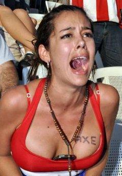 Model Larissa Riquelme cries while watching her team lose to Spain, during a public screening of the World Cup match, in Asuncion July 3, 2010. From the files of bountiful self-promotion — Paraguayan lingerie model Larissa Riquelme is busting in on World Cup hype, announcing she’ll do a Maradona and run through the streets na-ked if her team wins the global soccer championship. The Huffington Post website reports that the 24-year-old Riquelme has stepped up to the starting line in support of h