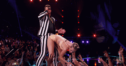 Miley Cyrus Twerking, already one of the web’s favorite pastimes, shocked and awed the world with last night’s raunchy display at the Barclays Center. Aggressively gyrating on Robin Thicke like a horny wild child possessed, the singer was the talk of a talked-about event … for better or worse. Miley pulled double duty at the event, performing a stuffed bear-themed version of “We Can’t Stop,” then joining Thicke for a rendition of his hit “Blurred Lines.” Only those lines weren’t blurred … they were crossed . Again and again and again. Miles danced like a hyper-sexual human condom, one whose purpose in life is to slap butts, hump anything in sight and elicit arousal and/or laughter. This was one for the ages, even by her standards. You can’t unsee this stuff. So follow the jump for the ultimate compilation of videos, GIFs and photos of Miley Cyrus Twerking at the Video Music Awards, like a woman possessed: Miley Cyrus Twerking at VMAs Miley Cyrus and Robin Thicke – “Blurred Lines” The Urban Dictionary calls Twerking “a series of movements made by females of the humanoid variety as an expression of contempt for their fathers.” Sorry, Billy Ray Cyrus. We are so sorry. Hang tough. Ditto Miley’s PR team. Eesh. Long day at the office? Billy Ray Cyrus Supports Miley Miley Cyrus Team: Concerned Over VMA Performance We imagine Miles’ parents had a bit of a tough time stomaching this display last night, and struggled to know what to make of it like many others. In fact, they were very far from alone. The feedback came fast and furious on Twitter, and ranged from sickened to stupefied. Here’s a look at some of the best GIF, Twitter and video reactions: Miley Cyrus Video Music Awards Performance: Twitter Reacts! Miley Cyrus VMA Performances: Too Far? What do you think: Did Miley Cyrus go too far? Yes, what an inappropriate embarrassment! No, it was a lot of fun! She is just being Miley, people! View Poll » Did Cyrus go too far with her lewd antics? Did Cyrus go too far with her lewd antics? Did Cyrus go too far with her lewd antics?