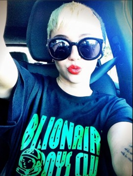If you follow Miley Cyrus on twitter and I sure as hell hope you don’t…because despite being over 18, legal and tight bodied, following her every move is just fucking weird, you can just let me follow her for you, you know since I can pretend my masturbating to her tight body is for business. That said, she’s been up on all the mainstream rappers and producers lately. I’m talking songs with Snoop and Will.I.Am. Tweets to with French Montana and Pharell. She’s even started a twerk team, in some tween identity crisis cuz she didn’t have a childhood and lives a sheltered existence weirdness. Well now, she’s wearing one of Pharell’s clothing company’s shirts. Making me think her obsession with the darker skinned side of the music industry, is getting creepy. That’s like me only masturbating in my Miley World Tour shirt from 5 years ago that is 4 sizes too small because it was the only one I could find on Ebay, only more public. That said…check out those hot red lips….Erotic.