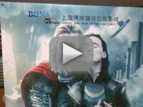 The critics’ Thor: The Dark World reviews were mixed, but no one will dispute that this is hilarious: A Chinese theater used a fan-made poster to promote the film. A mistake? A clever guerilla, viral marketing effort? Either way, it’s great. Chinese Movie Theater Uses Fan-Made Thor Poster The critics do love Loki. Maybe Thor does too, more than we thought. The artwork in question shows Thor (Chris Hemsworth) clutching the villainous Loki (Tom Hiddleston) in a loving embrace, which he clearly doesn’t do. The actual poster, which inspired the parody, shows the hammer-wielding hero pulling the same move on girlfriend Jane (Natalie Portman), instead. Check out both after the jump …